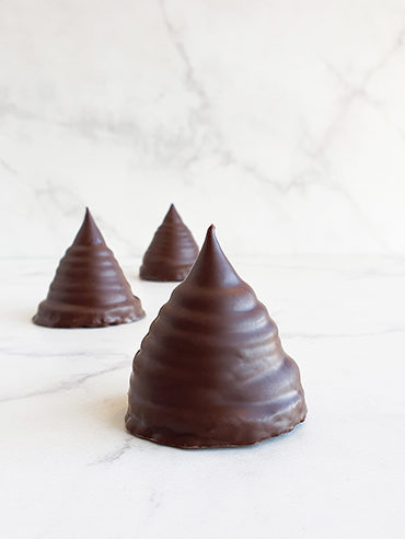 Masa crocante de harina, cacao 70% y almendras. Relleno con dulce de leche, bañado en chocolate blanco.